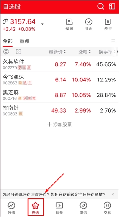 用户添加完成的多支自选股,可点击首页下方的【自选】选项进行查看。
