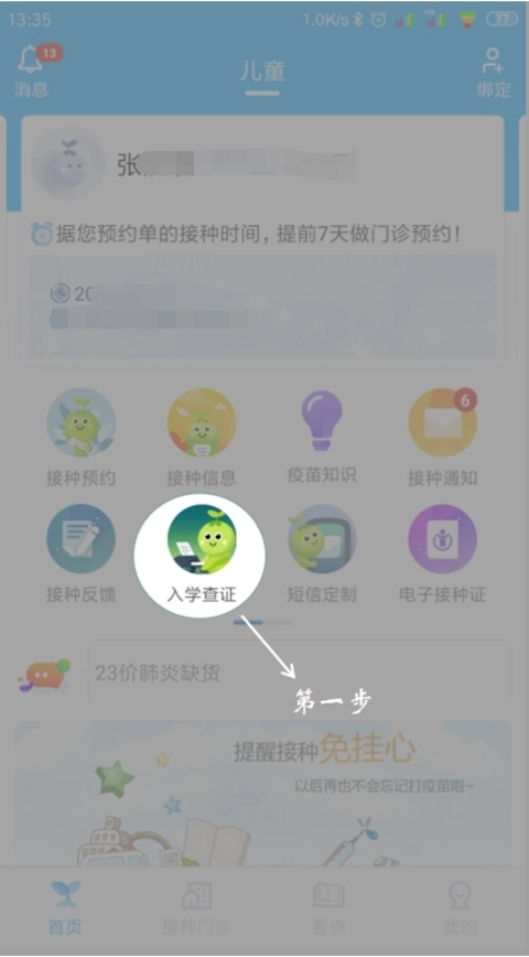 1、第一步进入app首页处点击【入学查证】(部分城市可能无此功能渠道,可以联系当地预防接种单位进行处理)