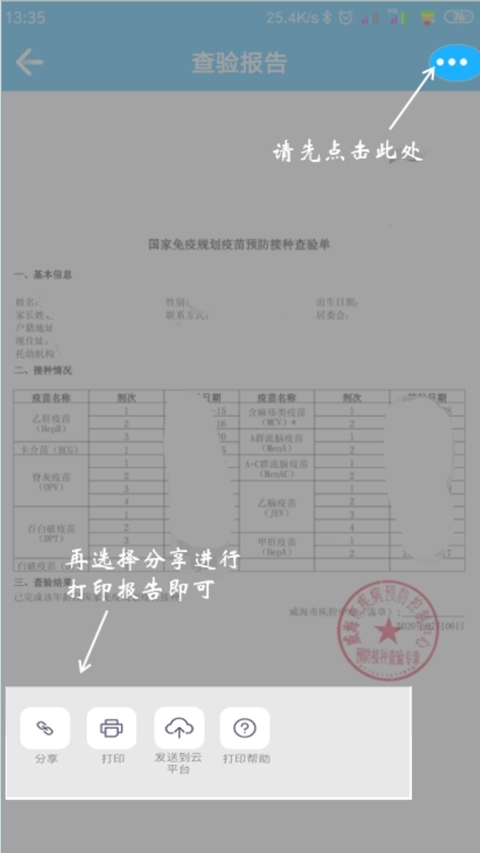 3、接着就可以匹配出已接种儿童的接种报告了,用户还可在该页面先点击右上角的扩展功能图标,然后再点击底部分享或打印进行生成查验报告
