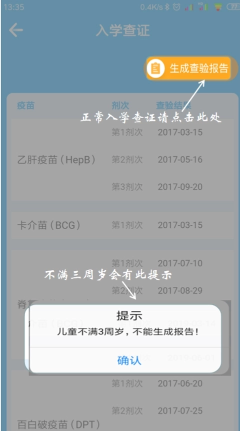 4、另外如果儿童不满3周岁是无法生成查验报告的,如下图页面所示会弹窗,还有接种疫苗不全的或没有进行实名绑定儿童信息的也是无法生成查验报告的