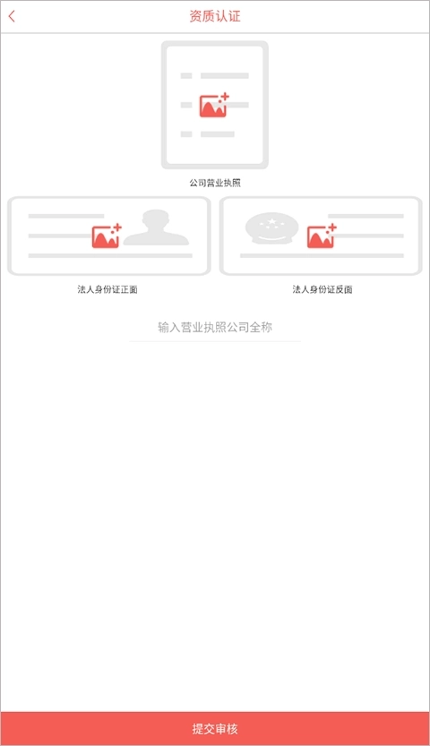 2、来到认证界面按要求添加公司营业执照、法人身份证正面、法人身份证反面,输入营业执照公司全称点击提交审核即可。