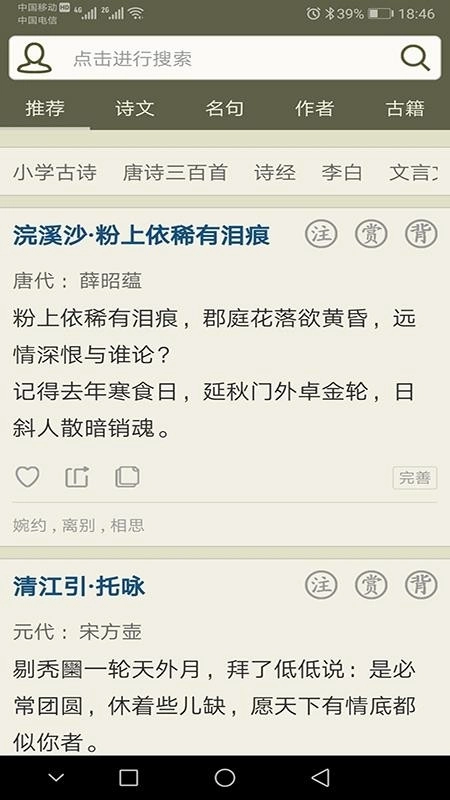 5、在推荐页面,可浏览热门搜索的古诗文