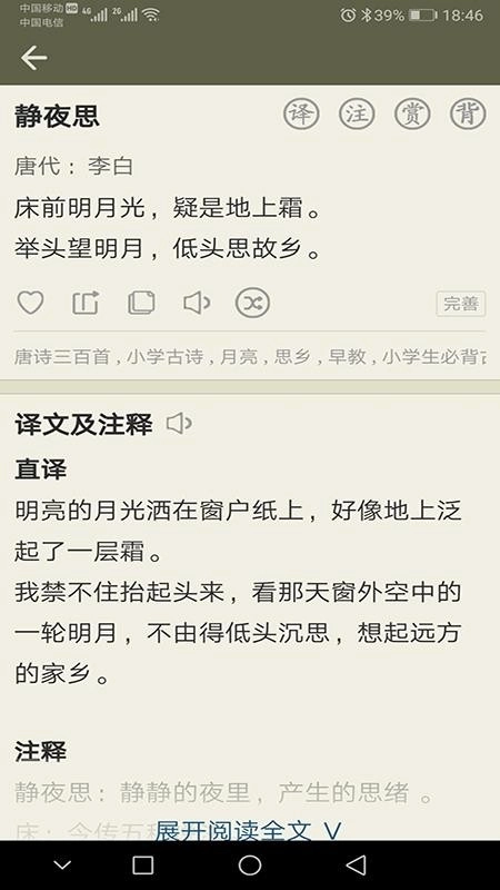 7、点击赏析,快速查看古诗文的赏析内容