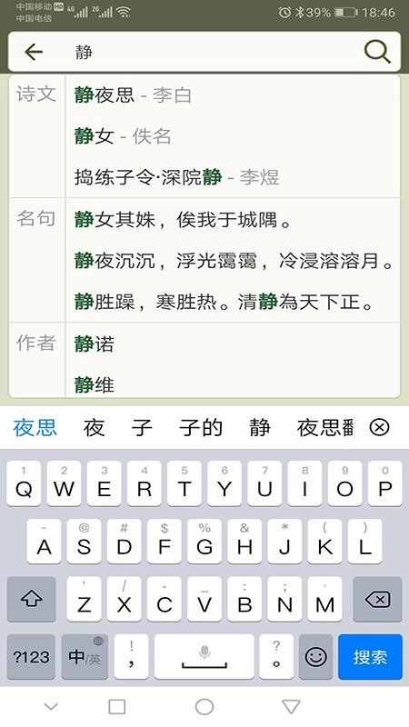 2、搜索功能,对近百万首古诗文进行标题搜索、正文搜索、类型搜索;