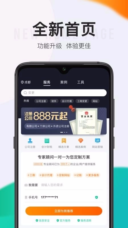 4、智能匹配专家顾问,您只需在此输入所需服务及手机号,系统便会智能匹配合适的顾问。