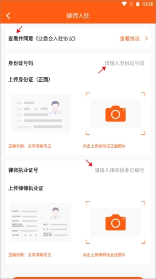 2、首先需自上而下核对并填写身份证与律师执业证的相关信息,上传对应的证件照片,完成上述操作后点击下一步。