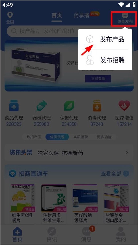 1、启动药脉通app,登录后进入主页,用户能在主页浏览药品代理、器械代理、保健代理、医疗增值、招商直通车等板块,点击右上角的免费发布按钮,选择发布产品选项;