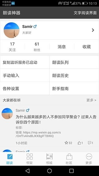 3、支持复制网址自动解析网址内容后直接朗读,支持将喜欢的内容网址收藏到云端,并分享给其它用户。