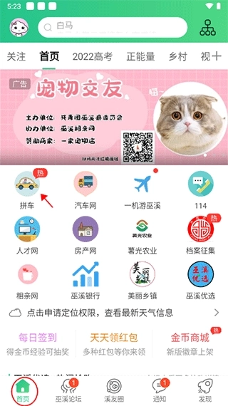 1、启动巫溪信息网app,进入首页后点击“拼车”选项。