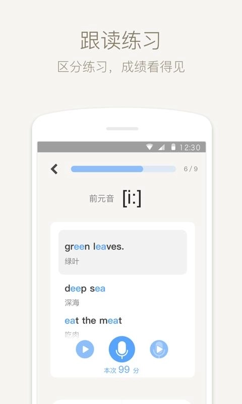 4、音标发音功能:通过播放原声发音供用户对比,帮助其发现自身发音的短板,从而提升发音的精准度。