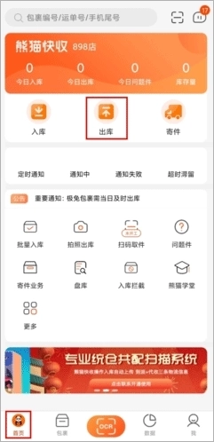 1、打开熊猫快手收app后,在首页里点击出库按钮;