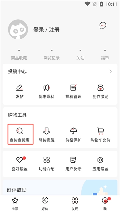 1、点击进入我的界面,选择查价查优惠;