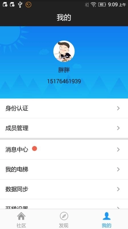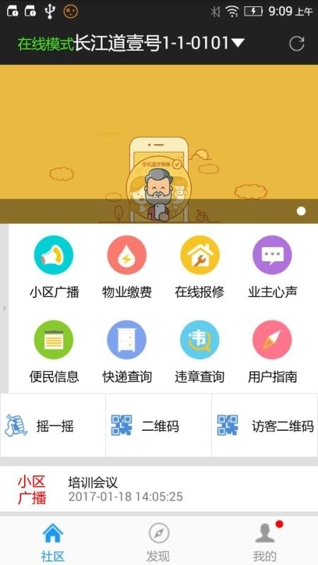 社区页面设有小区广播、物业缴费、在线报修、业主心声、便民信息、快递查询、违章查询等功能板块。