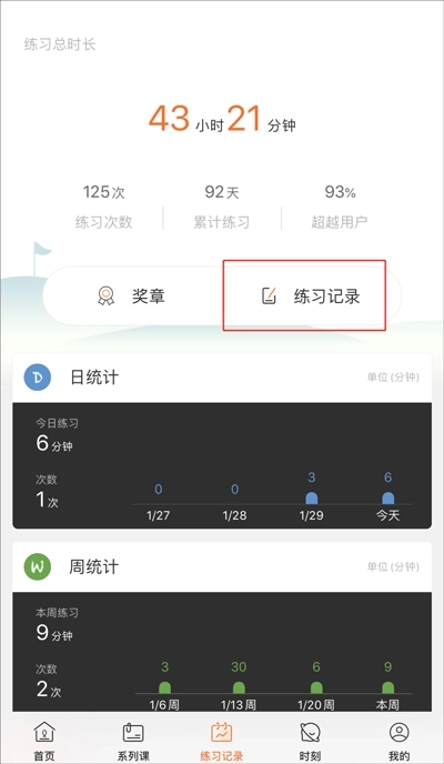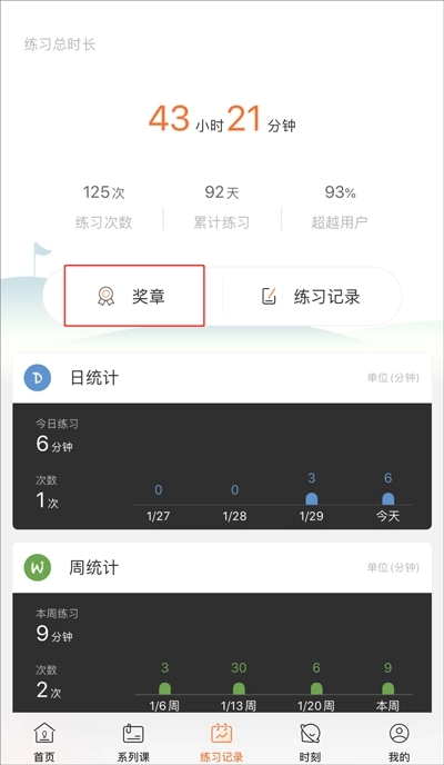 APP设有奖章体系,每一枚练习奖章都需要坚持练习才能解锁。尽管目前获得这些奖章后暂无会员奖励服务,但它们对你来说依旧意义非凡。就像下图呈现的,练习记录模块还具备丰富的练习数据统计功能,能从日、周、月的维度全方位展现你持续练习的过程,每个维度下都配有便捷的数据分享功能,便于你向朋友展示。