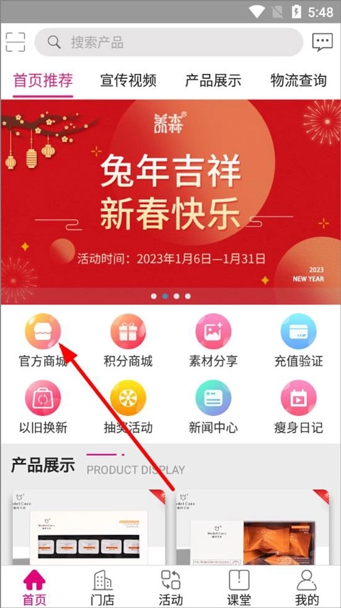 1、打开养森app并登录进入首页,首页设有推荐产品展示、宣传视频、物流查询、官方商城、积分商城、素材、新闻中心等功能板块,随后点击官方商城;