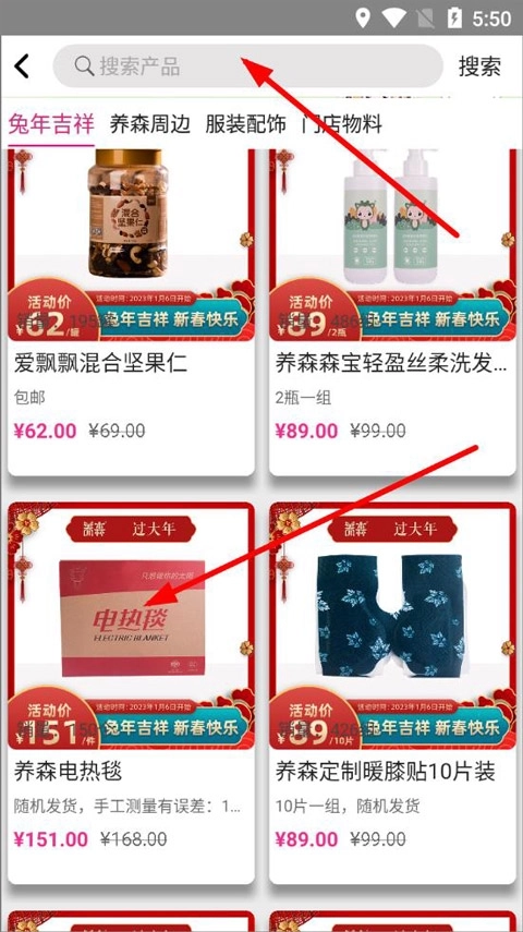 2、进入购物页面,页面有新年新品、养森周边、服装配饰、门店物料等,用户可在搜索框搜索产品,也可下拉选择需要的产品;