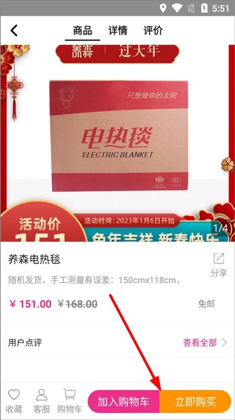 3、点击进入商品详情页面,即可查看商品名称、价格、用户评价等信息,还能进行收藏商品、联系客服等操作,也可直接点击加入购物车或立即购买按钮。