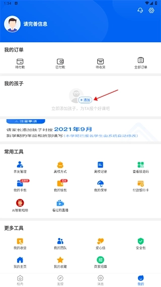 1、打开软件后,点击“我的”,在“我的孩子”下方点击“添加”。