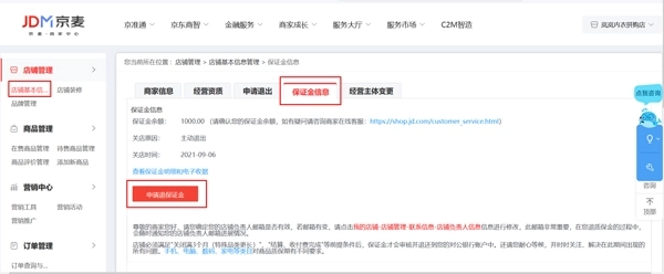 申请入口:【商家后台】-【店铺管理】-【店铺基本信息管理】-【保证金信息】,点击申请退保证金。