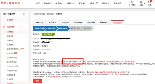 提交审核后,您可以在保证金信息页面查看相关进度。您销售的商品需符合对应的质保期要求,系统会依据您商品的质保期自动显示预估的退款审核时长,请您耐心等待。