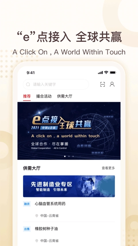 4、全球范围内的中小企业可随时入驻中银e企赢平台,平台汇聚的无限商机能够实现全球共享。