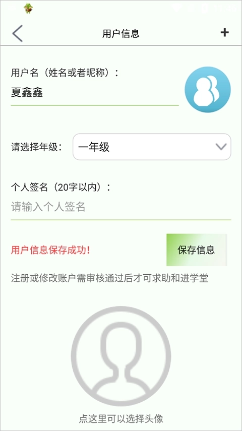 2、在“用户信息”中,可以输入用户的名字、选择年级以及上传头像,之后点击“保存信息”。