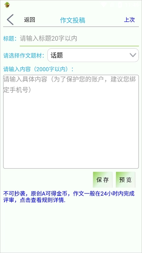 注:不可抄袭,原创A可得金币,作文一般在24小时内完成评审。