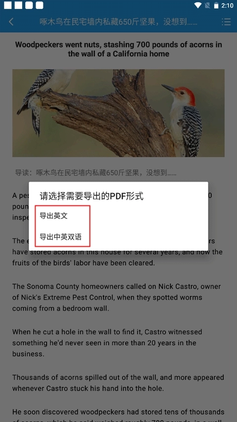 2、这时出现了两种导出PDF形式的选项:导出英文、导出中英双语,根据自身的需要来选择;