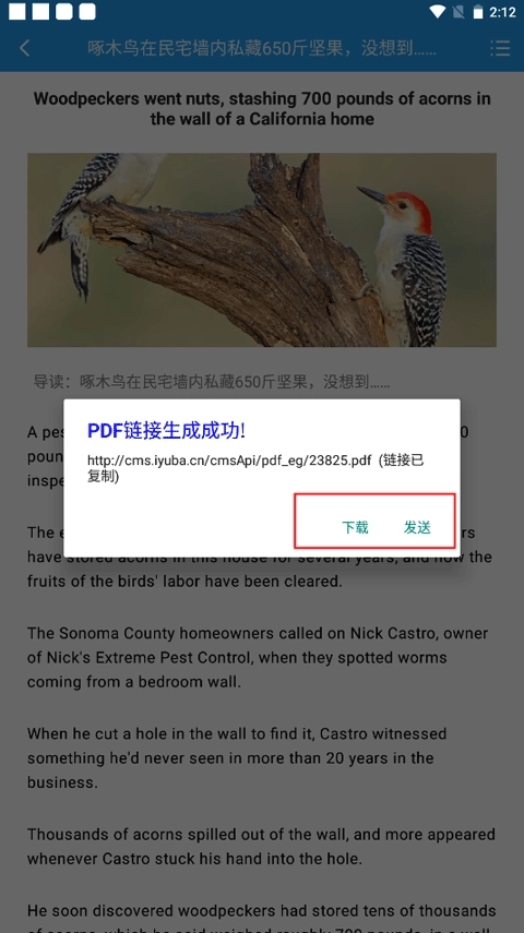 4、成功生成之后,就会出现PDF链接,有下载和发送两个选项。如果是发送可以发送到自己的微信号里。