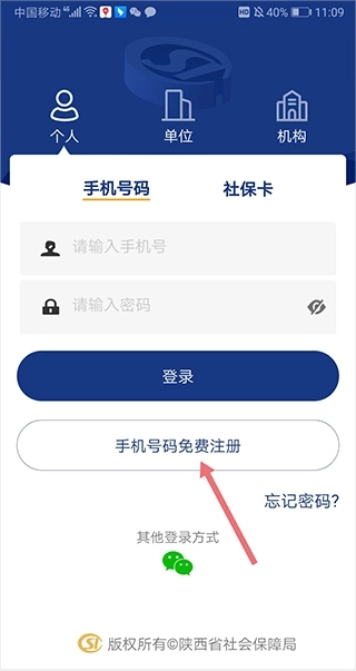步骤一:打开“陕西养老保险”APP,进入登录页面下点击下方的“手机号免费注册”