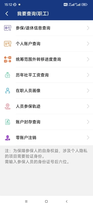 2、完成上述功能后就可以进入应用首页处点击【业务查询】,然后再点击【个人账户查询】,看一下自己本年已经缴费的是哪几个月