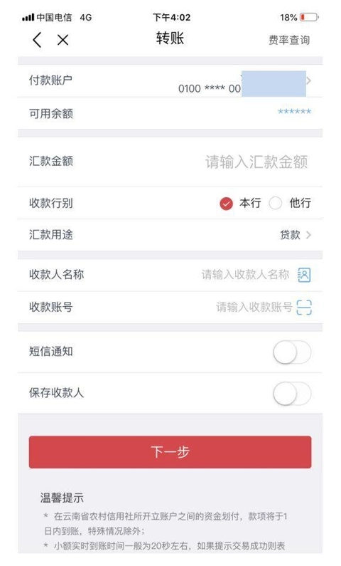 1、打开云南农信企业版app并完成登录,点击【转账】选项,选择对应内容并填写相关信息后,点击【下一步】