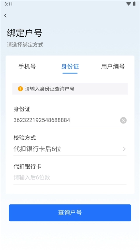 2、即可通过手机号、身份证或用户编号三种方式及其校验方式就能绑定用电户号。