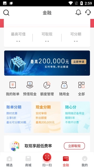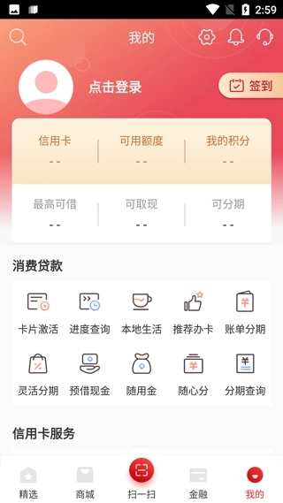 提供办卡、查账、额度、积分、还款、精彩权益等功能。