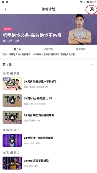 2、挑选你想要退出的计划,点击右上角的“训练计划设置”选项。