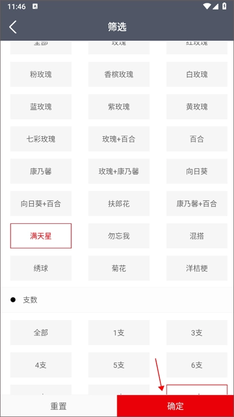 2、你既可以用搜索框来搜索鲜花关键词,也可以通过筛选功能快速找到自己想要的鲜花,并点击确定。