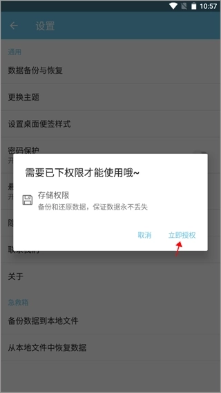 3、第一次备份的时候会弹出一个提示“需要下方的权限才能使用”,点击右边的“立即授权”。