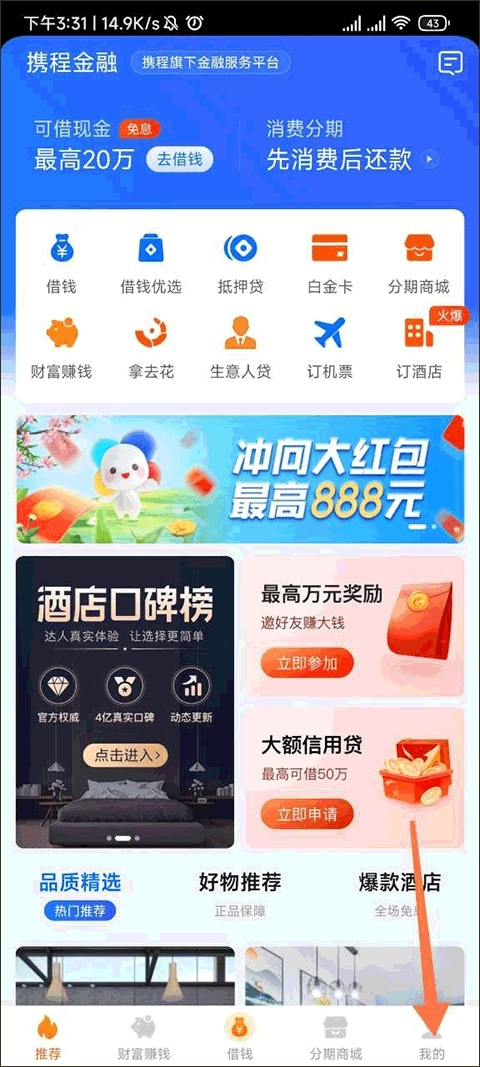 首先进入到携程金融app中,点击底部列表中的我的,进入到个人界面。