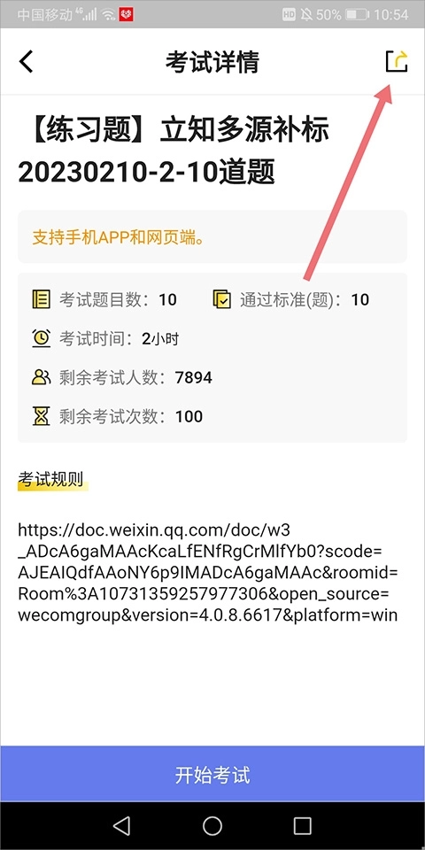 如果用户想知道考试答案,可以使用一些刷题软件进行搜索,或者在考试页面中点击右上角的分享按钮(下图红色箭头所指)