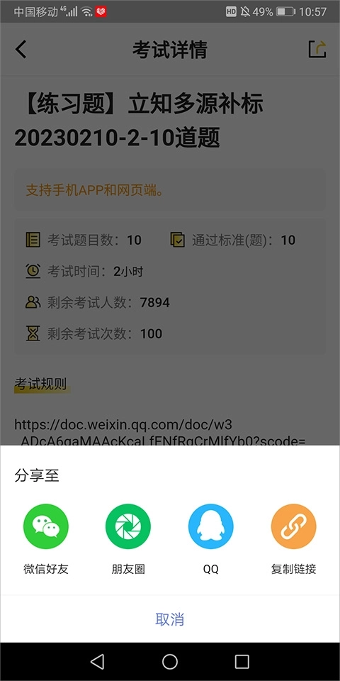 在底部弹出的分享面板中选择一种分享平台,将考试页面分享给参加过该类考试的好友进行答案咨询