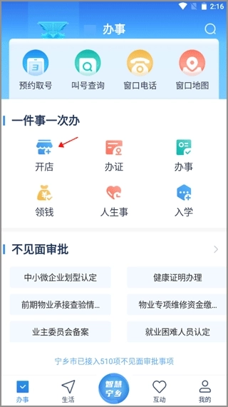 1、打开智慧宁乡APP进入首页,点击“开店”。