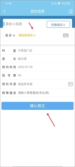 6、先选择要挂号的就诊人以及号源,最后点击“确认提交”。
