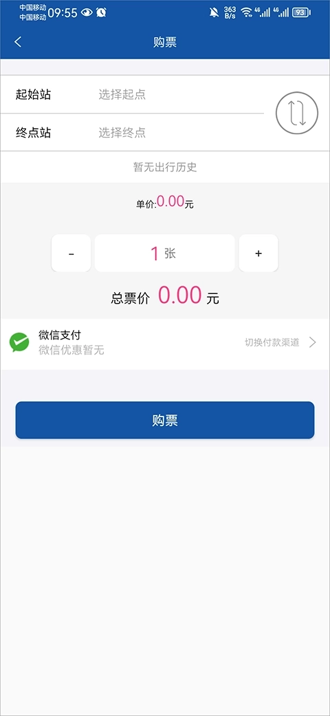 2、在车票购买界面,选择起始站及终点站,还可选择付款渠道,选择完成后点击购票购买单程票