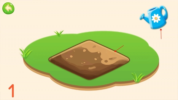 3、点击数字1,会看到左下角有一个数字1,右上方有一个水壶,中间有一块土地,将壶里面的水倒到土地上。