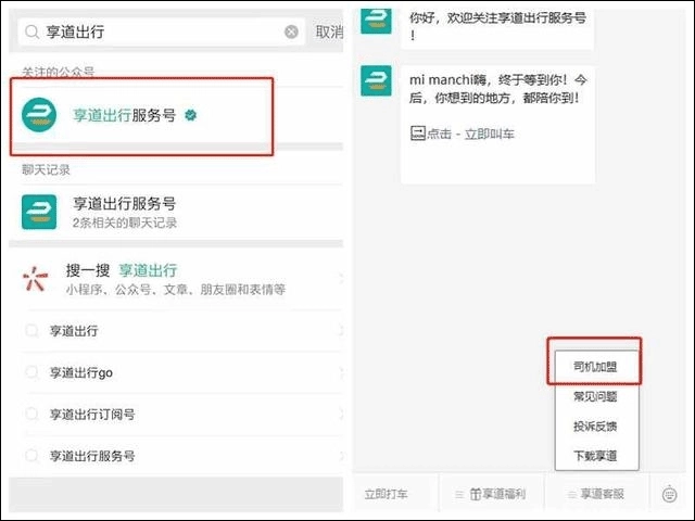 2、进入服务号后,点击有下角的“享道客服”,选择“司机加盟”选项,进入加盟界面后,上面有对应的要求,满足条件的,点击页面下方的“加入享道”;