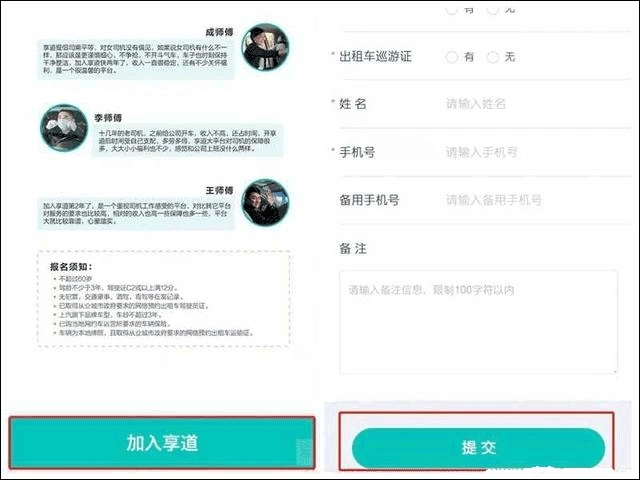 3、注册方法:先点我扫描头像,直接进入享道专车报名页面。再打开申请页面,填写手机并验证。完善个人资料、车牌、车型等信息。上传相关证件首页照片,申请成功,下司机端,等待审核。然后审核,开始接单。