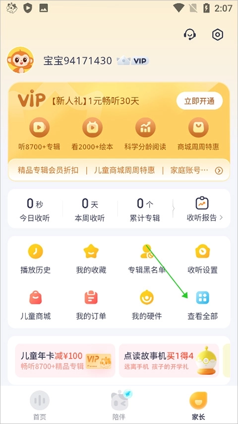 1、打开并登录喜马拉雅儿童APP,点击进入家长页面中点击【查看全部】(下图绿色箭头所指)