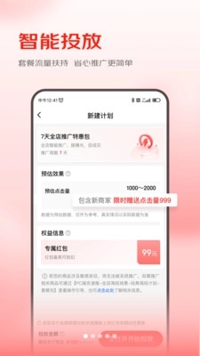 智能投放:极简、高效的一站式智投工具,帮助商家零门槛实现对商品推广、全店推广。套餐流量有扶持,省心推广更简单。