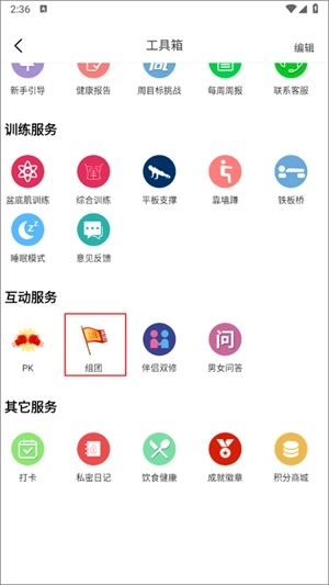 2、工具箱主要分为首页显示、新手服务、训练服务、互动服务以及其他服务等,如果想入团可以点击互动服务-组团。