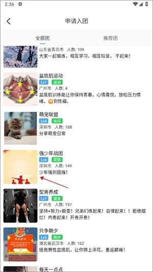 4、申请入团中划分了全部团和推荐团两个部分,选择其中一个点击进入到详情页面。